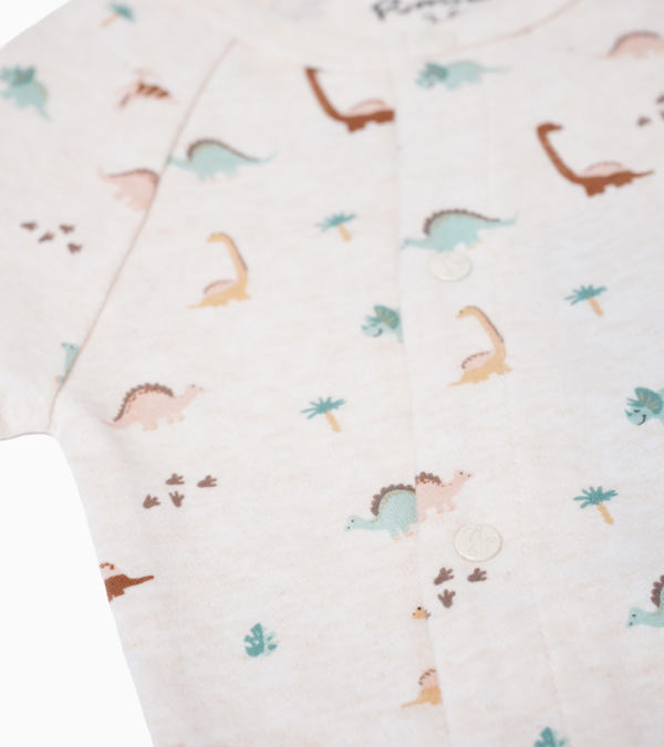Este hermoso enterito para bebé está confeccionado en 100% algodón, garantizando la máxima suavidad sobre la delicada piel de tu pequeño. El encantador estampado de dinosaurio en tono beige aporta un toque divertido y moderno que conquistará a toda la familia.