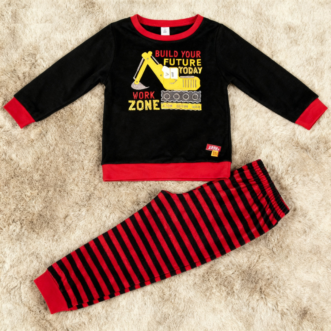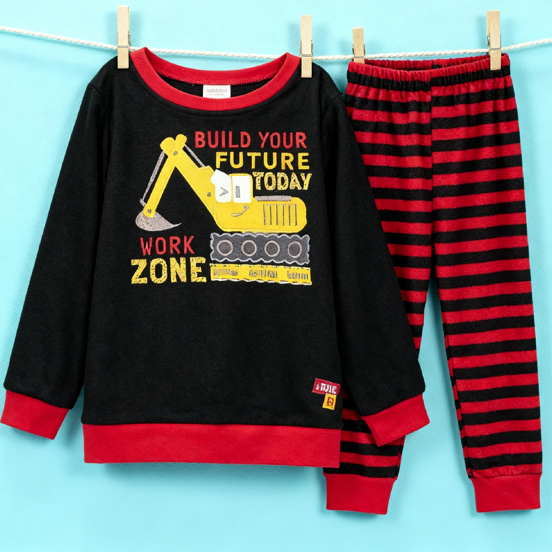 Este pijama micropolar presenta un diseño temático único de bomberos y constructores que despertará la creatividad de los más aventureros. La polera cuenta con un llamativo estampado frontal de camión que transportará a tu hijo al mundo de los héroes cotidianos, mientras que el pantalón a rayas con puños ofrece comodidad y estilo en cada movimiento.