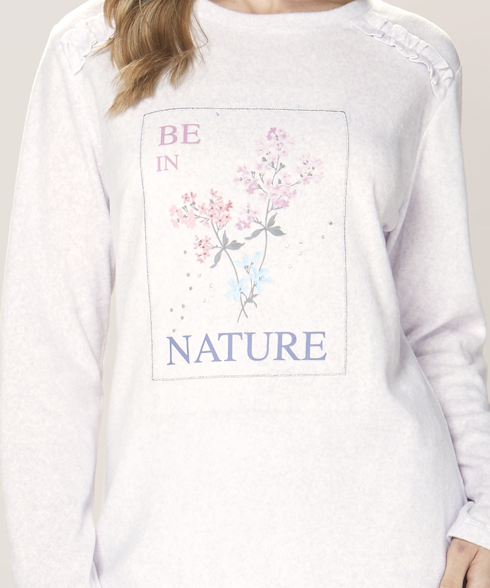 El diseño floral con mensaje «Be in Nature» convierte este pijama en algo más que una prenda de dormir. Es una declaración de amor hacia la naturaleza y un recordatorio constante de mantener esa conexión especial con el mundo natural, incluso en la intimidad de tu hogar.