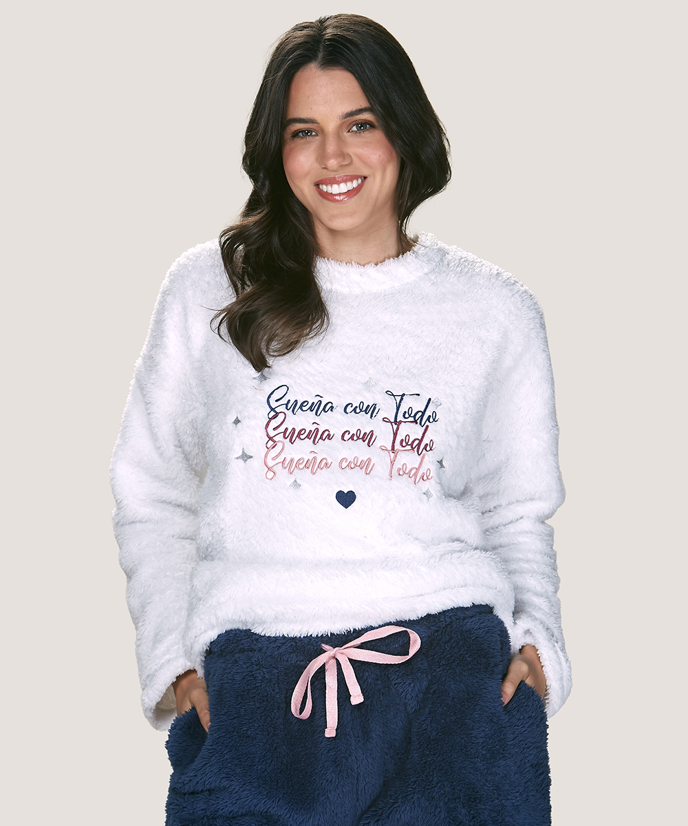 Pijama polar peluche ultra suave con frase inspiradora. Textura acogedora, pretina elasticada y máxima calidez. Lynette Chile