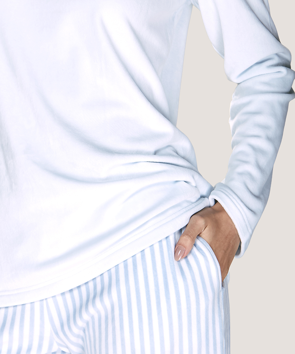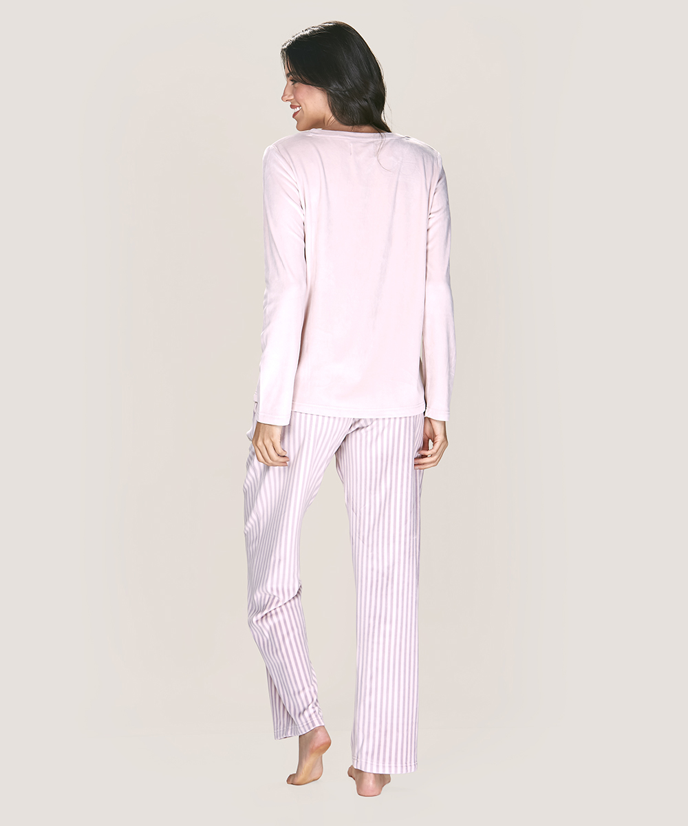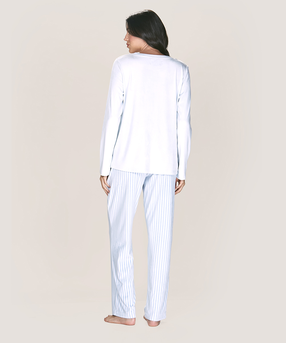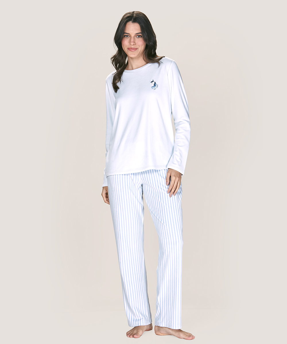 Pijama Soft Fantasía de dos piezas con estampado unicornio. Tela ligera, pantalón a rayas y bolsillos prácticos. Disponible en Lynette Chile.