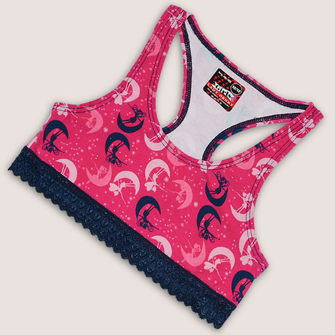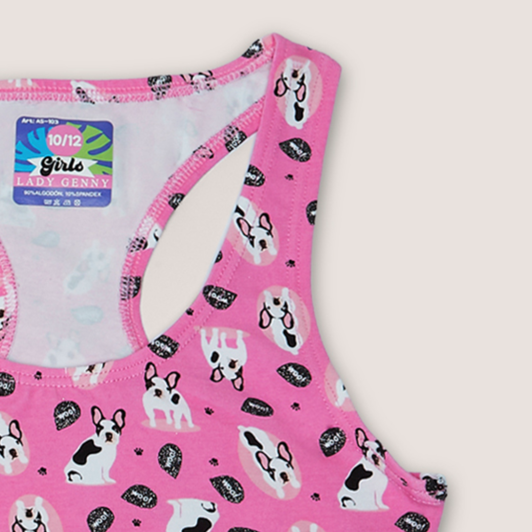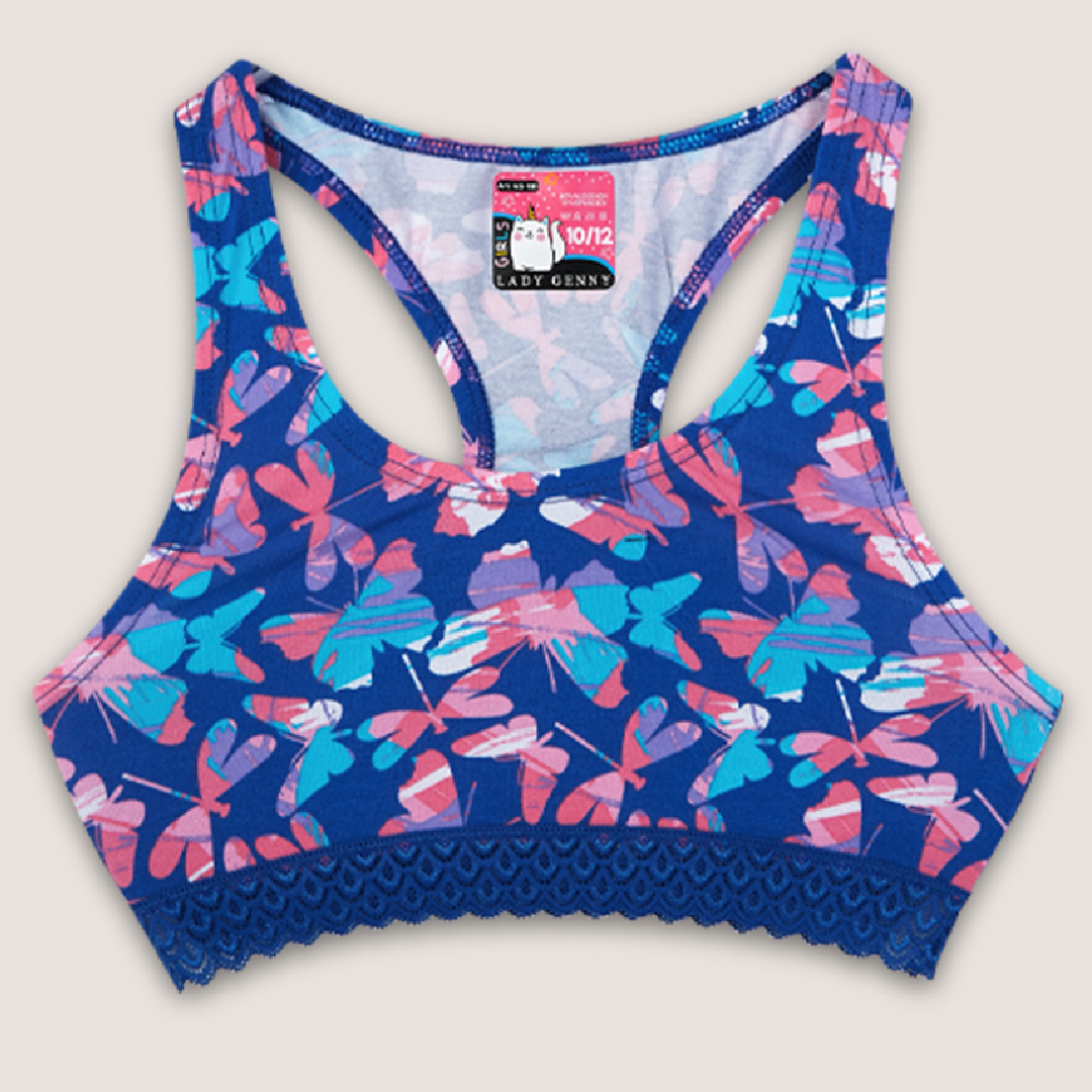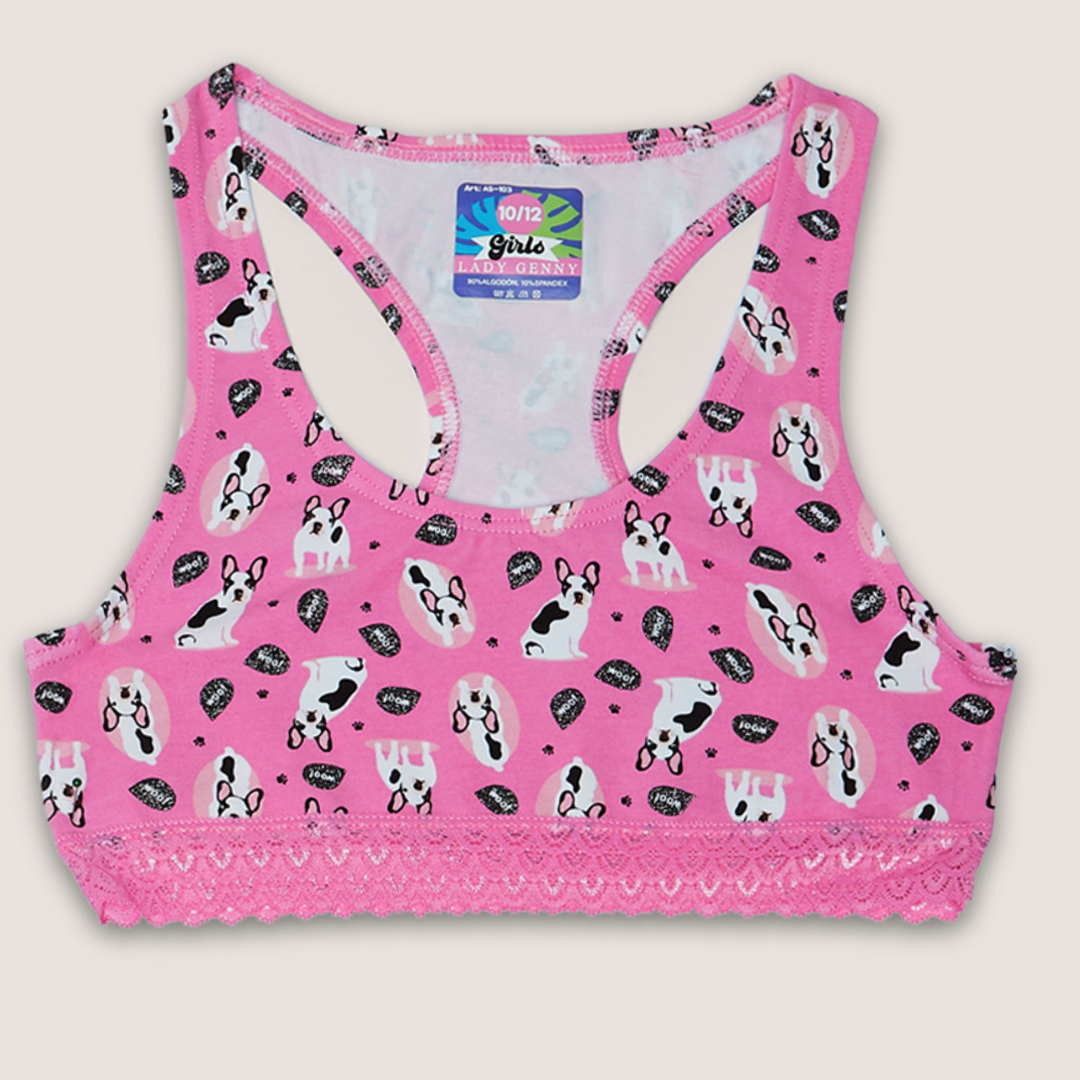 El Top de Algodón Estampado con Encaje para Niña | Suavidad es un top de algodón estampado, con espalda deportiva y detalles de encaje elasticado en el contorno. Además, la misma descripción te invita a usarlo como conjunto con su pantaleta AC-183, para que la elección sea aún más simple.