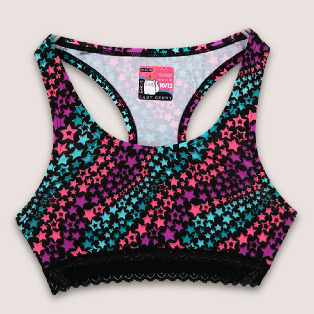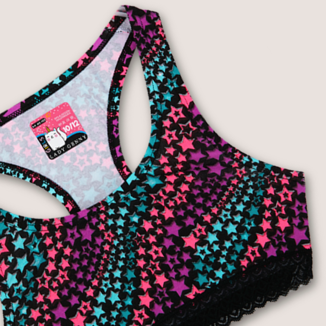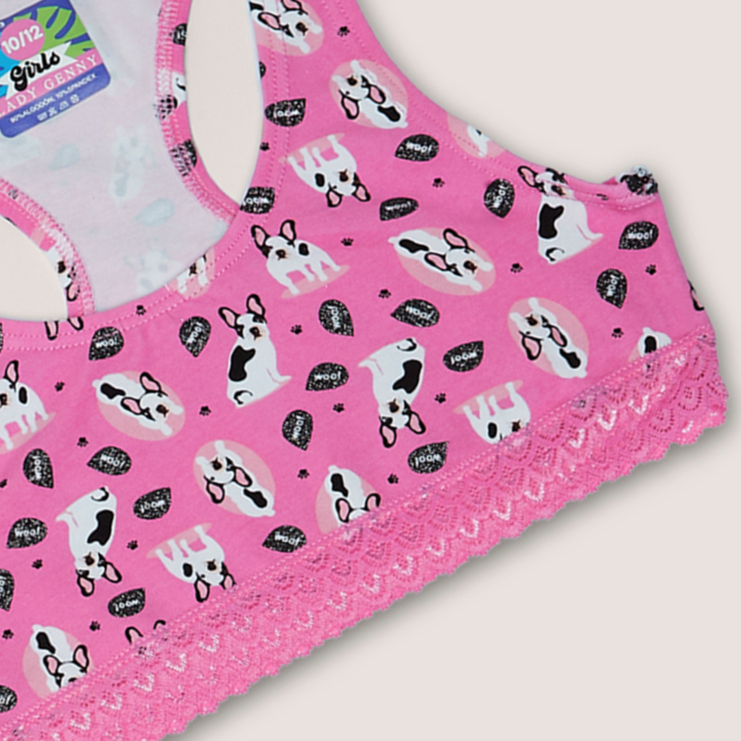 Top de Algodón Estampado con Encaje: espalda deportiva y encaje elasticado en el contorno, ideal para niña. Úsalo con la pantaleta AC-183 en Lynette Chile